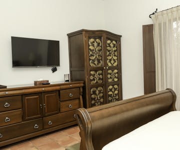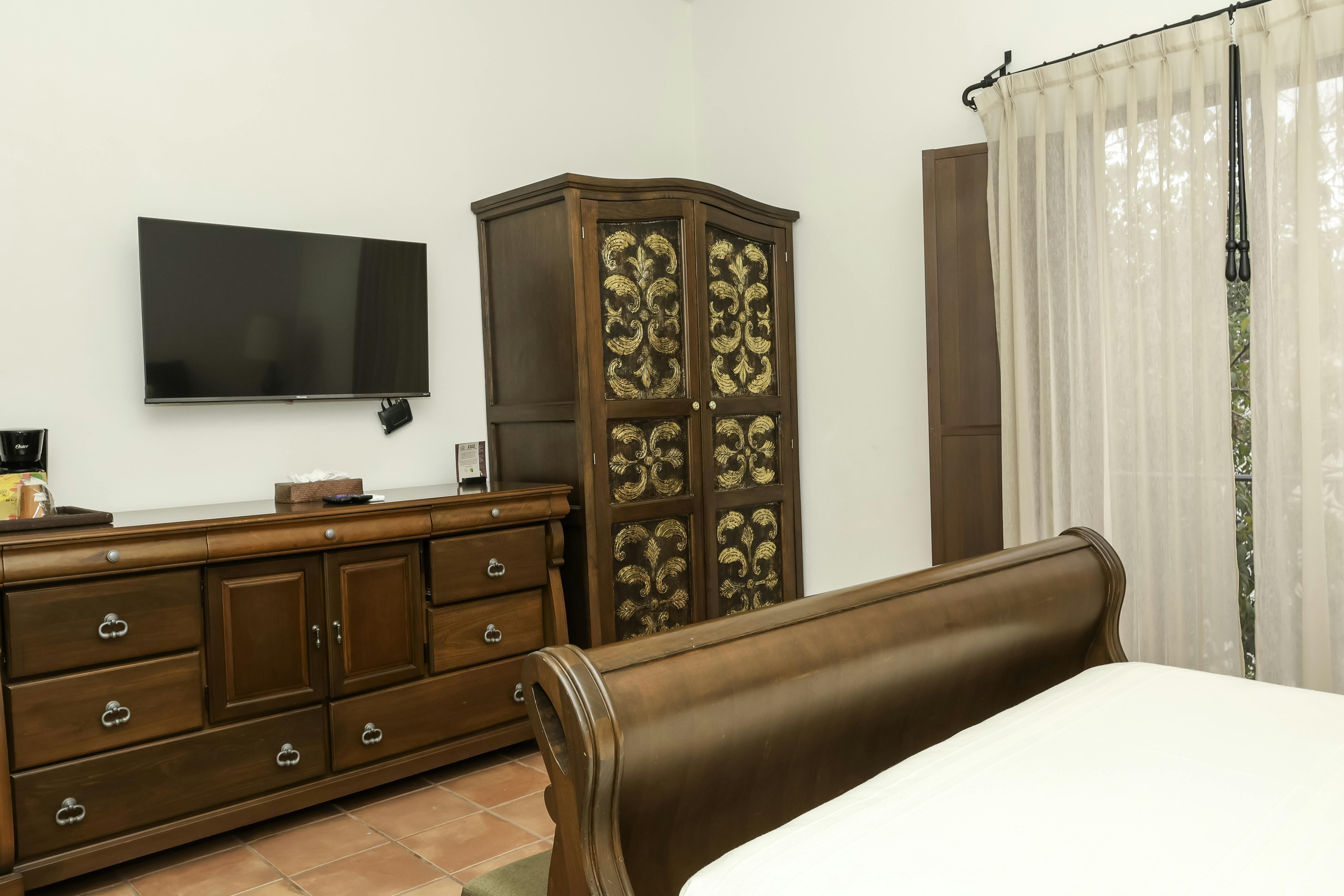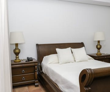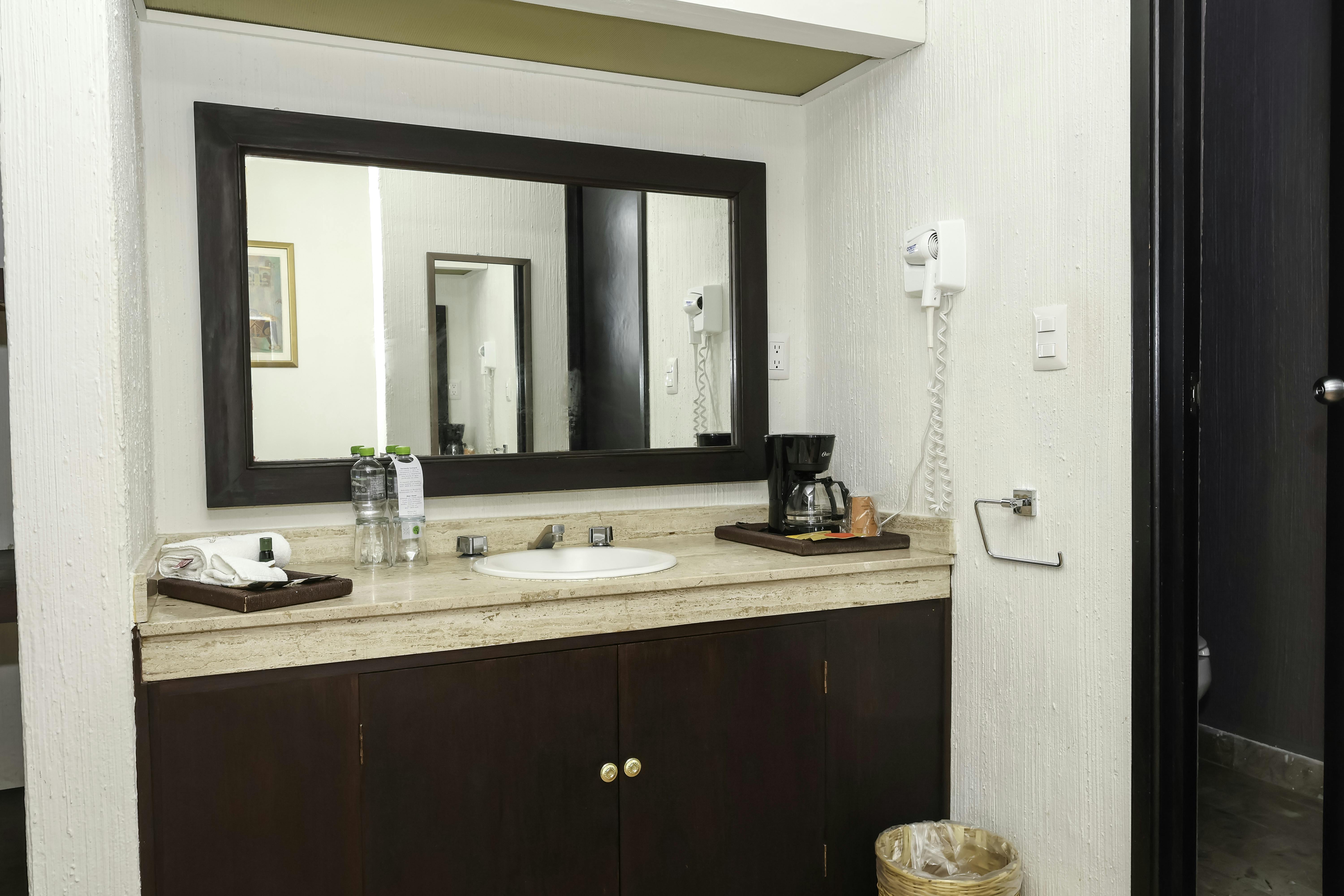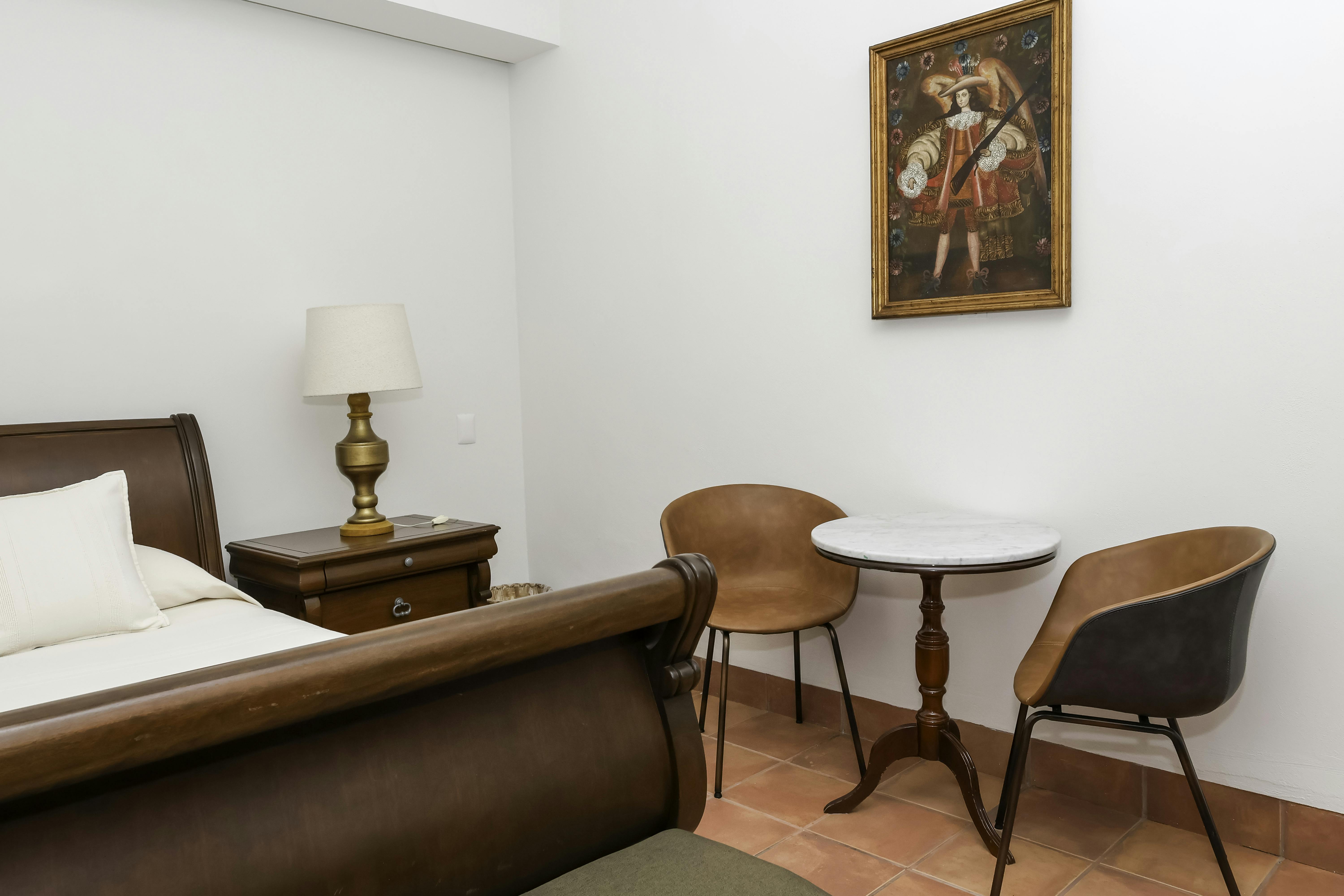 Única y luminosa Junior Suite con cama queen size, equipada con aire acondicionado, mesa de lectura, cafetera, wifi y televisión por cable, vista a las calles del centro de Oaxaca. Baño privado con secador de cabello y artículos de aseo gratuitos.